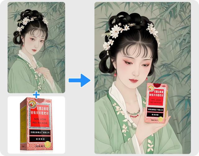 Vidu Q1 参考生图还可用于创意营销的产品素材,比如让林黛玉代言川贝枇杷膏。产品包装的细节、颜色、质感都与原图保持完全一致,古代人物与现代商品间的互动,有种穿越古今的反差感。