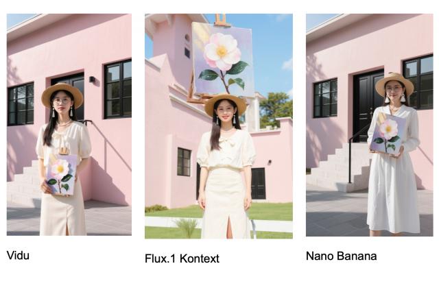 在案例 2 中,Kontext 容易出现眼镜丢失、背景错乱、人脸不一致等问题,Nano Banan 服饰变成了白色连衣裙,同时耳环也与原图不一样。在此案例中,Vidu 则能精准还原每一处细节,同时保持人脸、服饰、道具、场景都与原图一致。