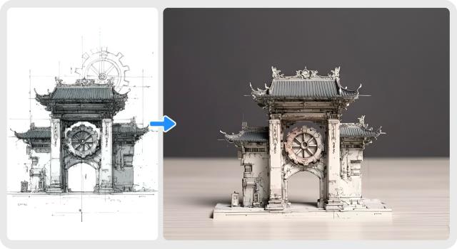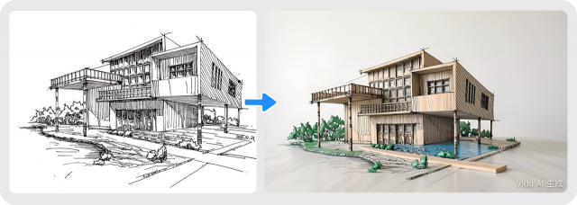 Vidu Q1 参考生图能将复杂的建筑设计图,直接转化为 3D 立体模型图,建筑细节精准还原,省去复杂的建模流程。