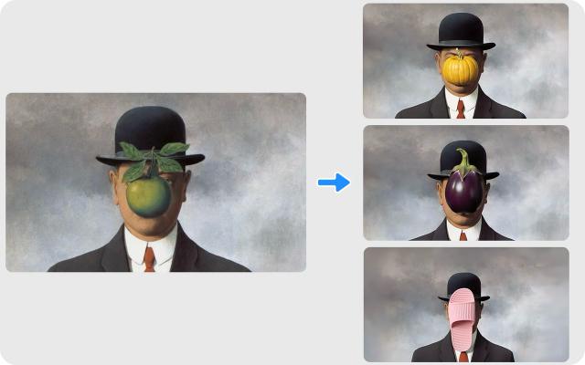比如利用 Vidu Q1 参考生图将超现实主义画家雷尼 · 马格利特的名画《人类之子》的经典绿苹果替换成茄子、拖鞋、南瓜,生成一系列趣味组图。
