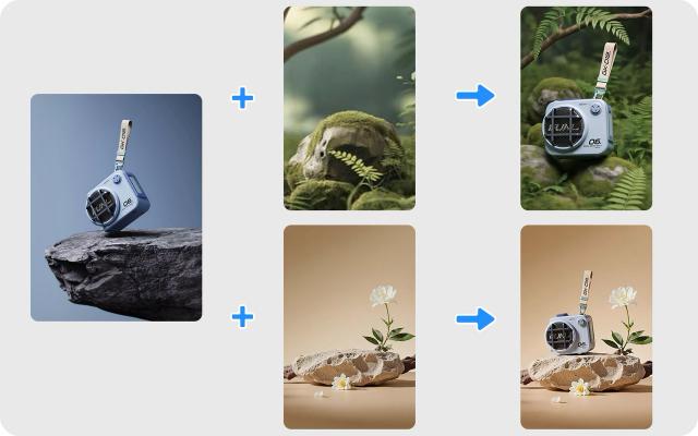 同样的背景,通过道具替换,可产出一系列产品素材图,适用于 TO C 玩法以及产品上新场景。