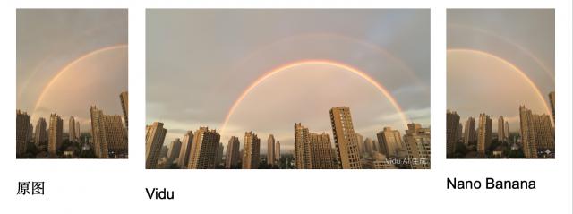 在上图的例子中,Nano Banana 并没有理解提示词中补全彩虹的意思,彩虹只出现了另外半边,而 Vidu Q1 参考生图则做到了将没有出现在图片中的另外半边彩虹补全,形成了完整挂在天上的双彩虹景象,表现出了极高的画面理解能力和一致性。