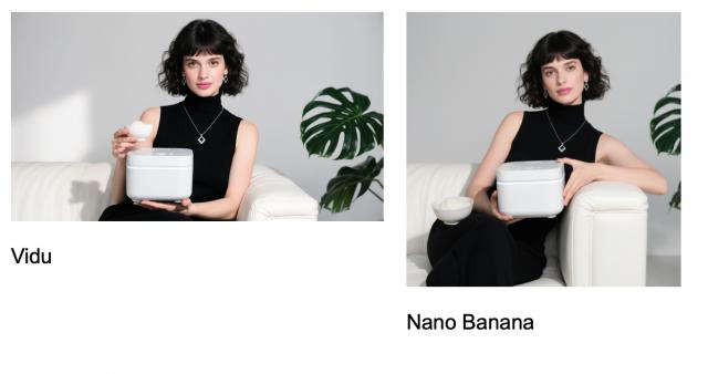 在人物拿着电饭煲的案例中,Nano Banana frequently 出现物体悬空、摆放不合理的问题,生成的饭碗并未放置到合理位置,而 Vidu 生成结果自然合理,符合物理规律;